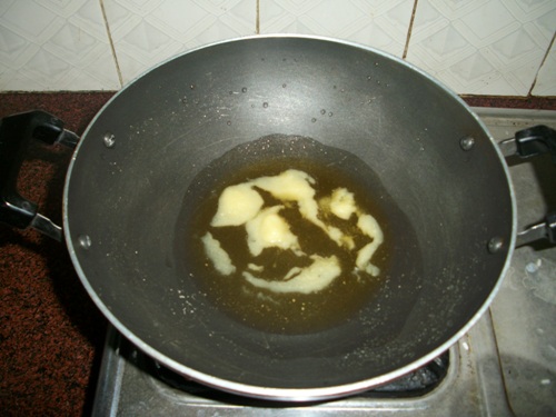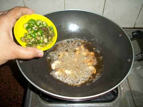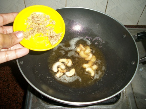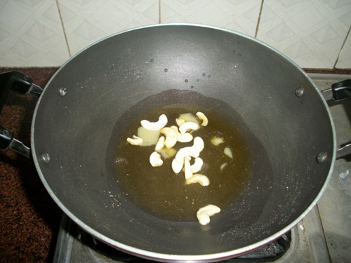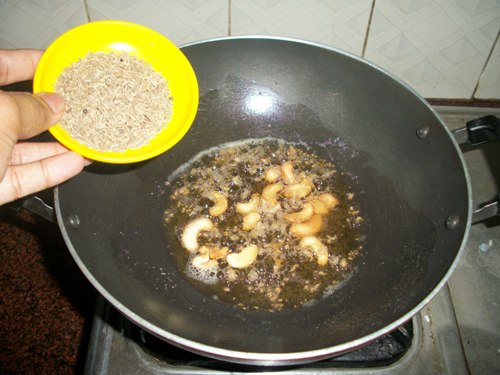 Heat ghee in a kadai and add in cashews, cumin seeds, pepper, ginger, green chilli, curry leaves and sauté this for a minute..