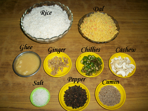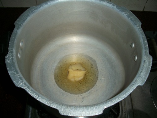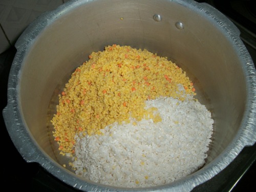 Heat 1 tblspn of ghee in a pressure cooker and add in rice and dal...Fry this for 5 mins..