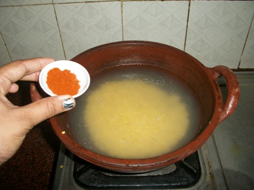 Drain it and put it in a kadai. Add 4 cups of water, turmeric, green chilli, garlic, ginger, curry leaves, coriander leaves, chilli powder and mix well.