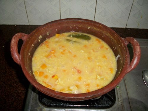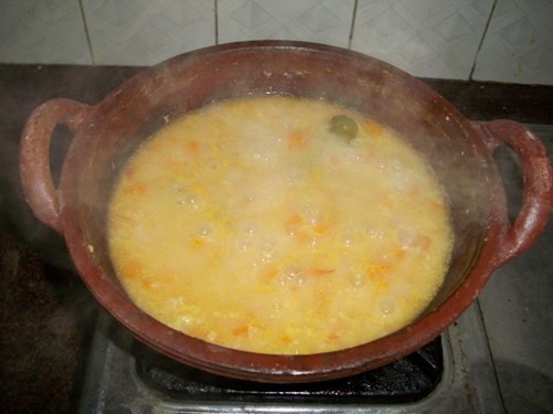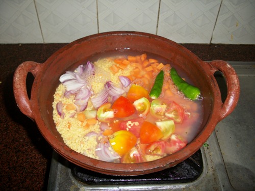 Now take dal,carrot,onion,tomato,green chilli in a kadai...Pour in 3 cups of water and bring that to boil.