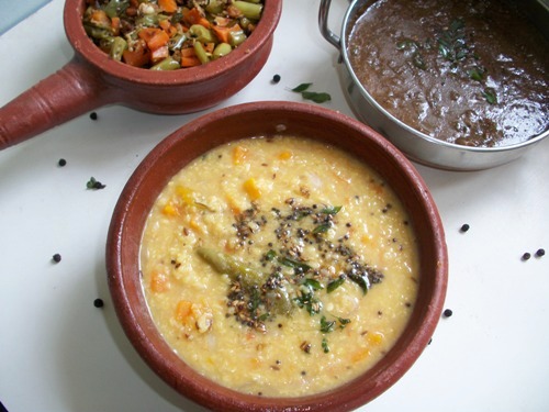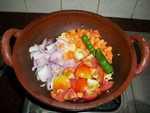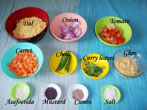 | Take dal, onion, carrot, green chilli, tomatoes in a kadai.... |